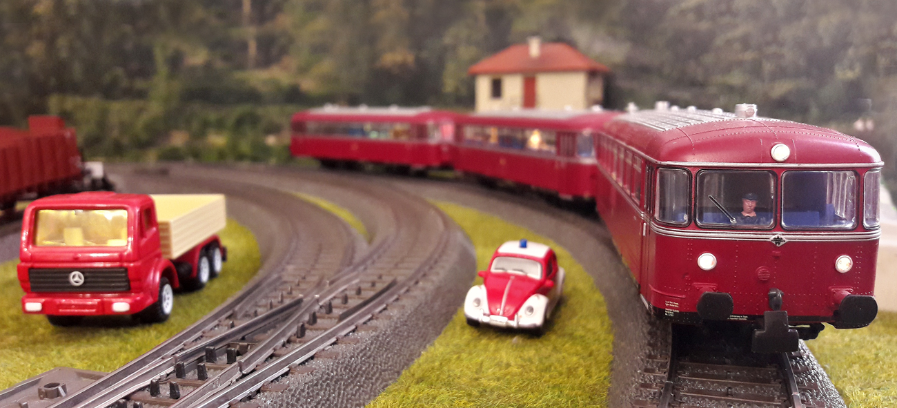 Der Roco-Schienenbus macht auf meiner Anlage durchaus eine gute Figur. Copyright by Kurt Tauber. Fenster schließen.