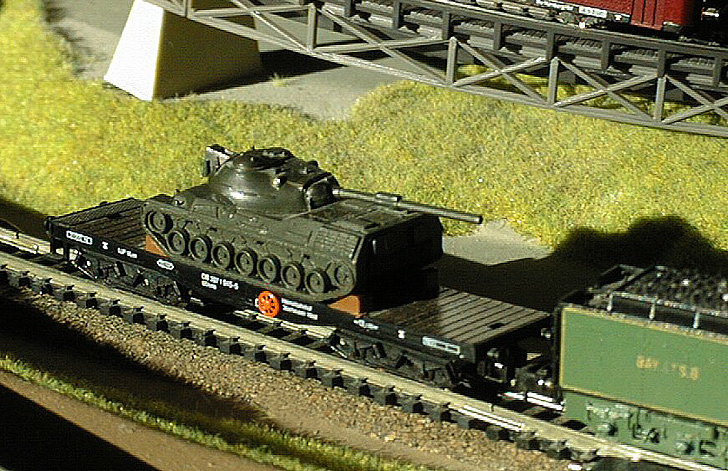 Eine Szene aus einer früheren Spur-N-Anlage mit Minitrix-Geleisen: ein Panzertransport (Roco).